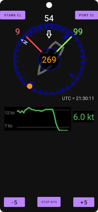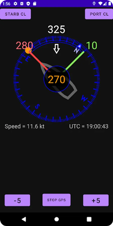 Ved å trykke "Starb CL" og "Port CL"-knappen kan vindretningen defineres på enten styrbord eller babord kryss-retning.
