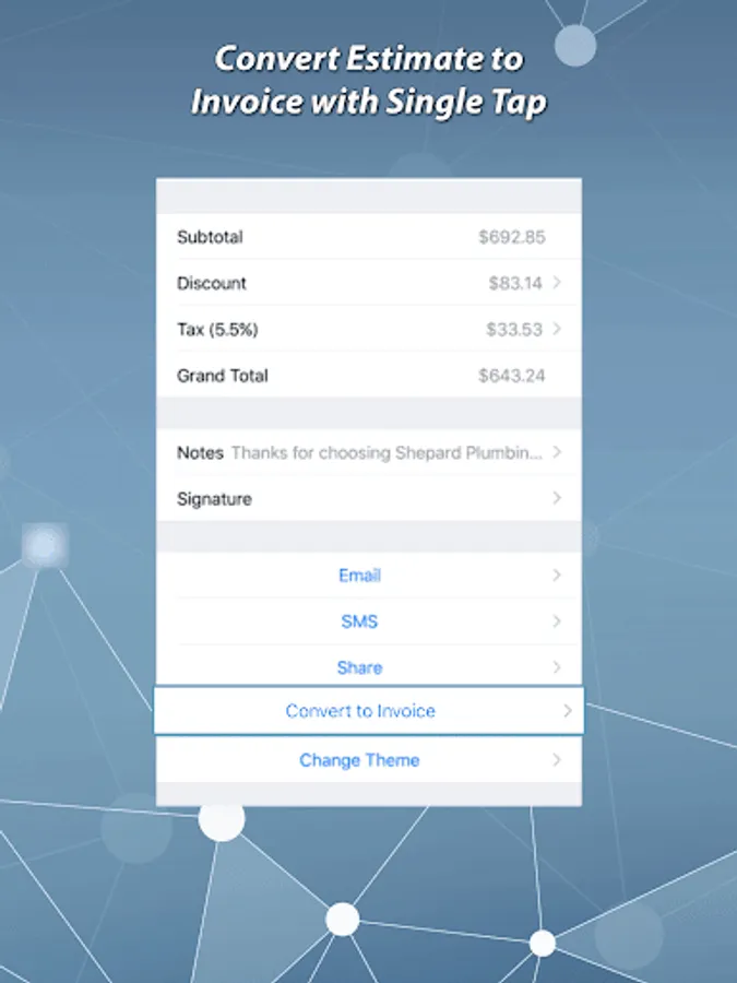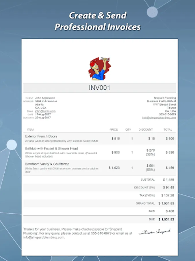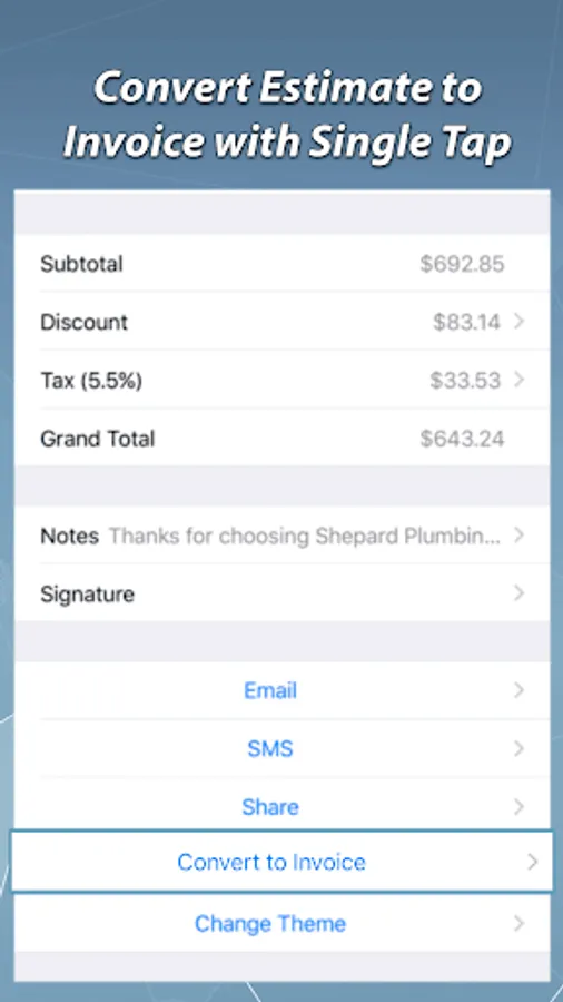 The app also keeps track of all the payments made towards an invoice. You can also sign the invoice or estimate on your device.