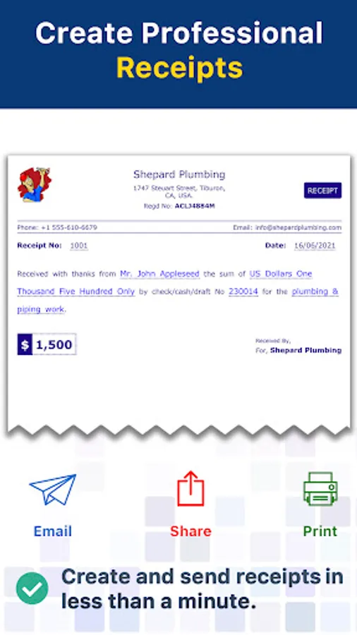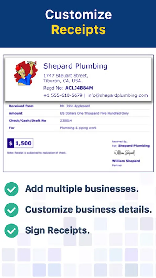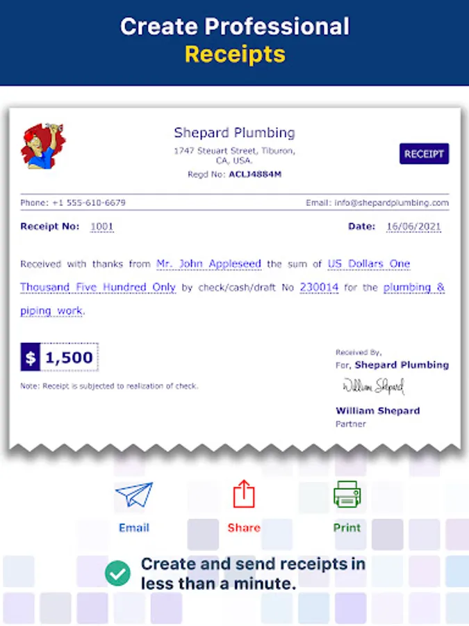 With the Receipt Maker app, you can create customized receipts and print, email, SMS, or share them. You can sign these receipts and send them to your customers with a single tap. Make the receipt with minimal information like customer name, service, amount, payment method, and receiver name.