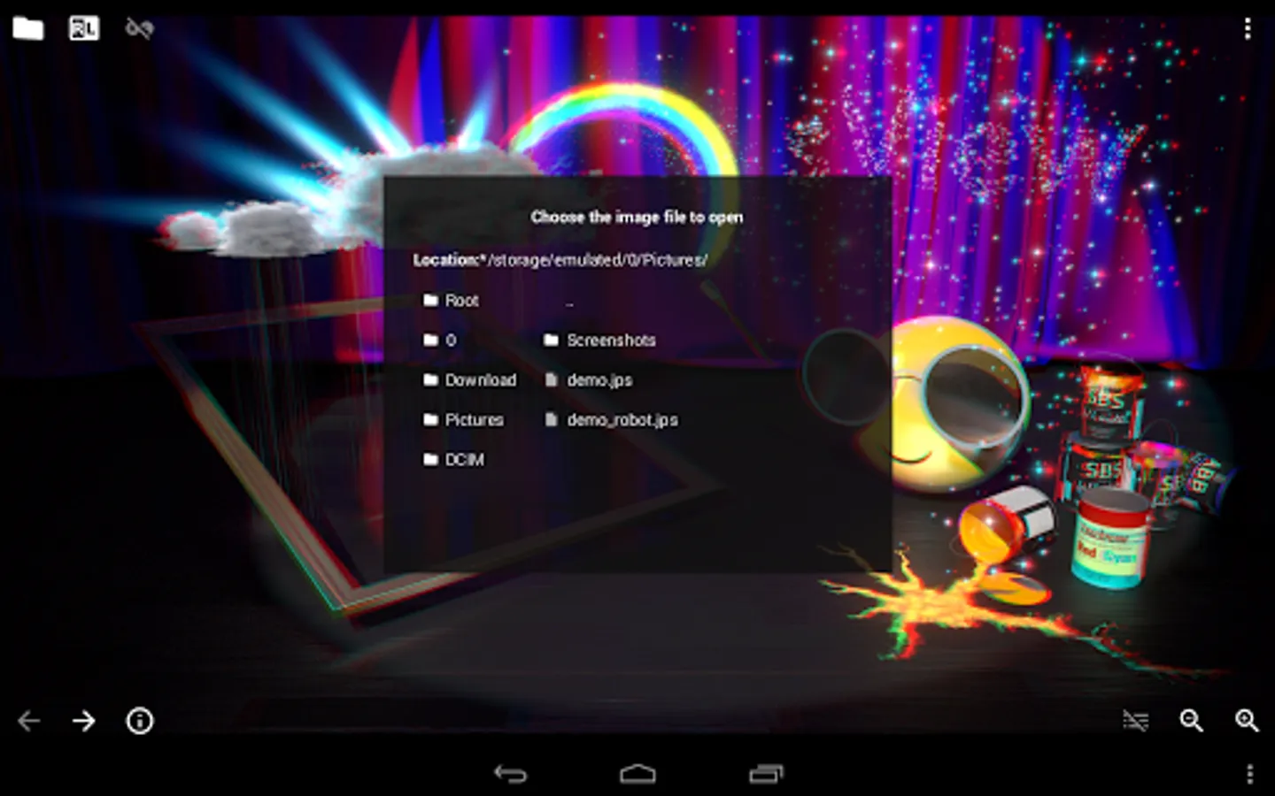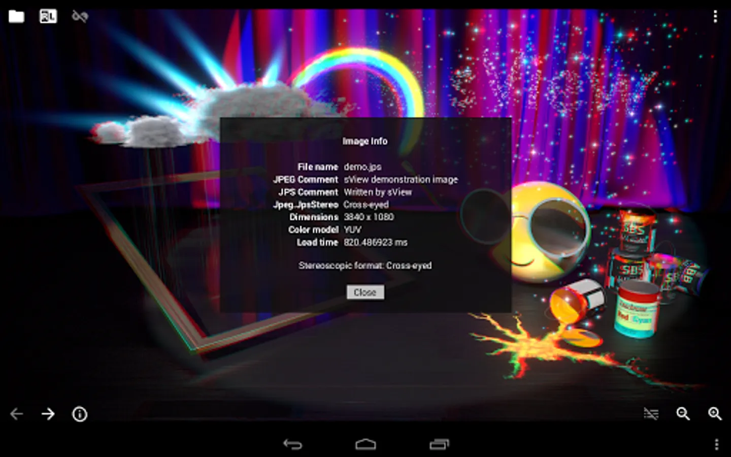 sView for Android is an open-source viewer for stereoscopic files (images and videos) supporting output in Anaglyph, Side-by-side, Over-Under and Interlaced formats.
