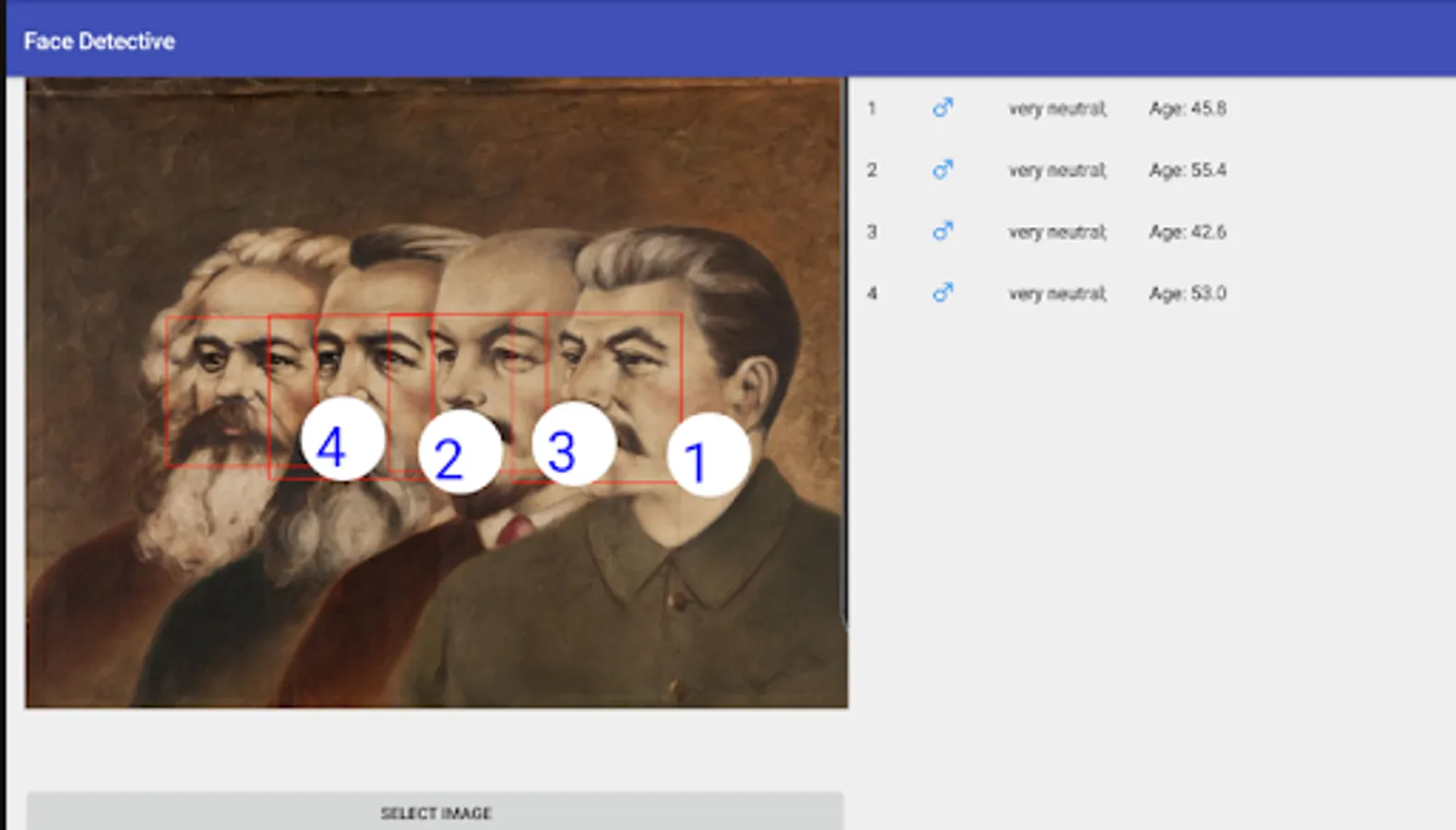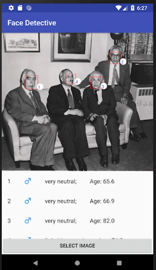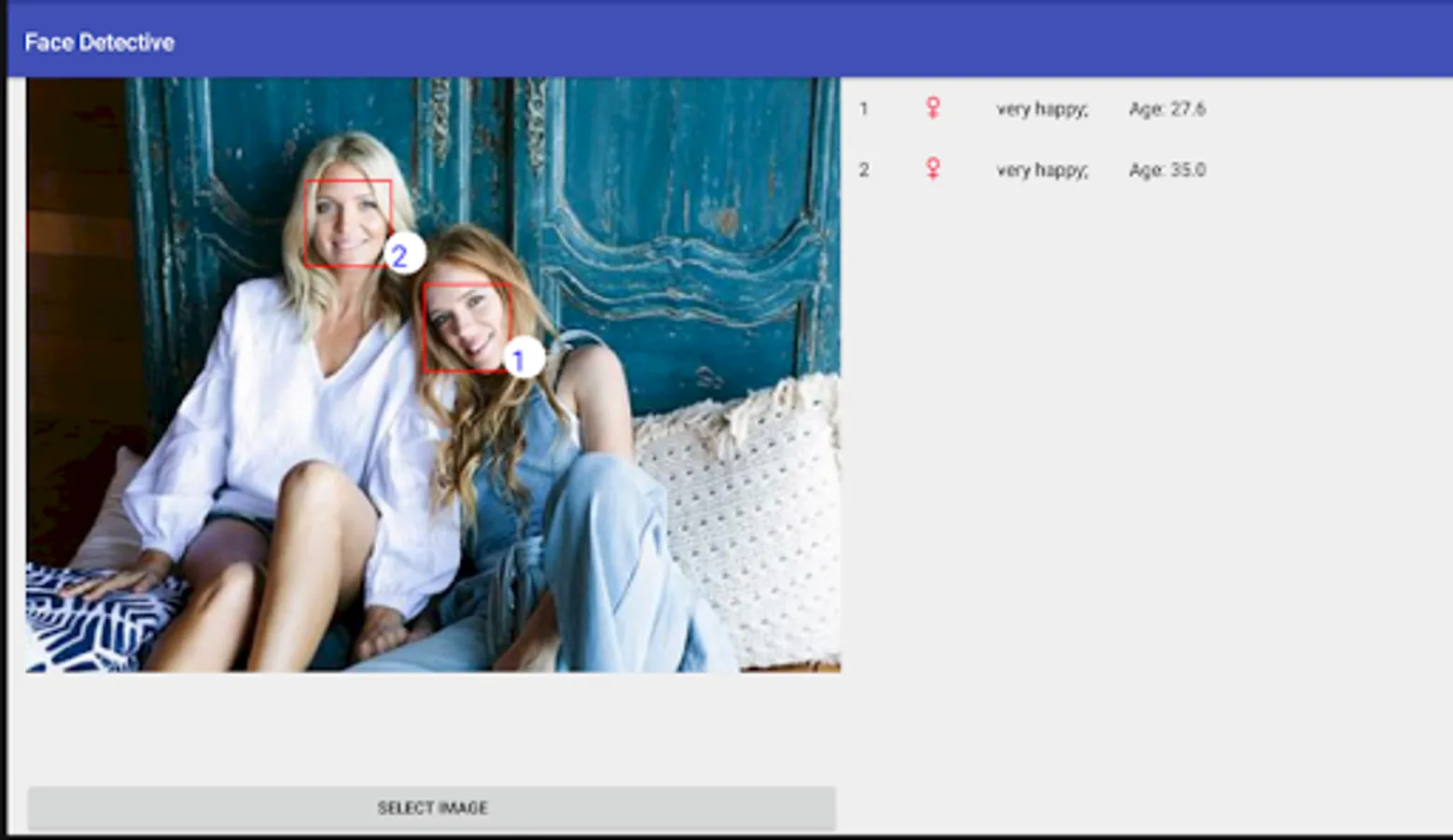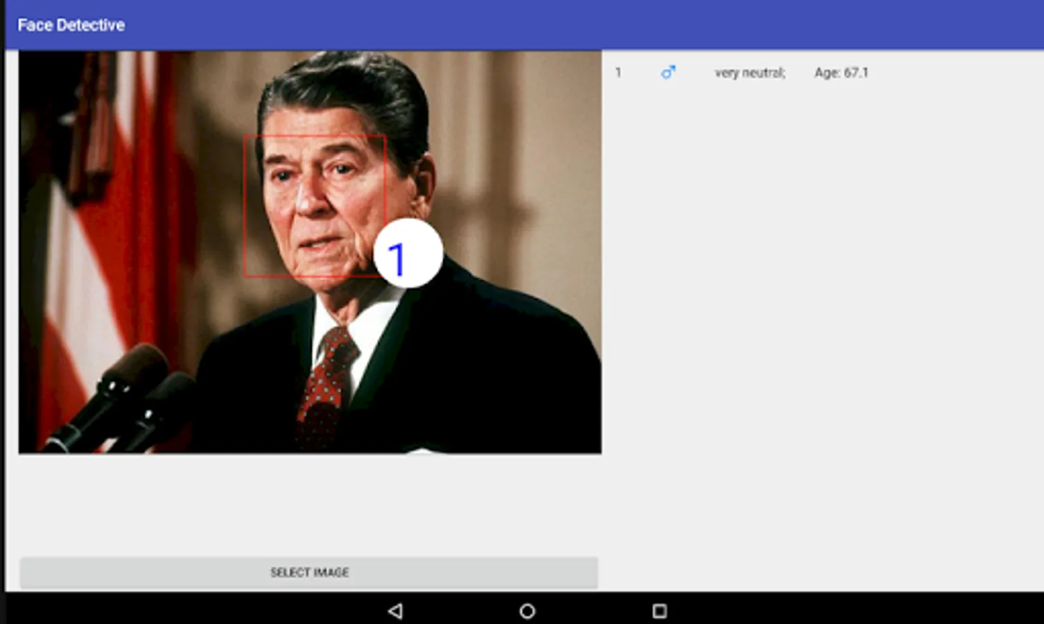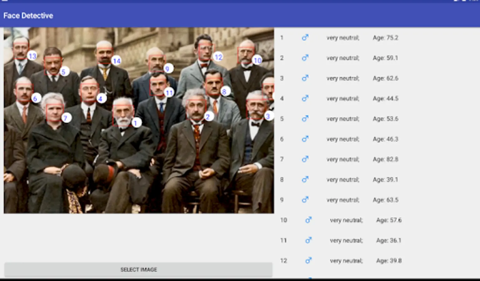 The App will detect faces in existed camera image or you can make new picture with your camera. The image will be processed using artificial intelligence and recognize persons age, gender, emotion, facial expressions like happiness, contempt, neutrality. The recognized age is not the person's real age, but how the person look like in that moment of time. You can try the detection with the same person but in different situations - smile, sad,...