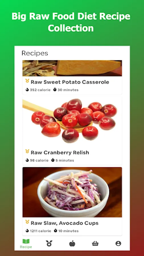 ● Huge raw food recipes collection consisting of breakfast recipes, main courses, desserts and salads.