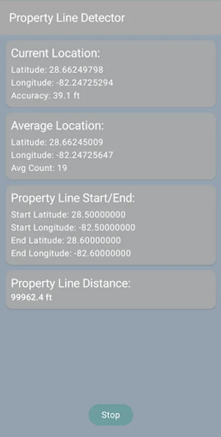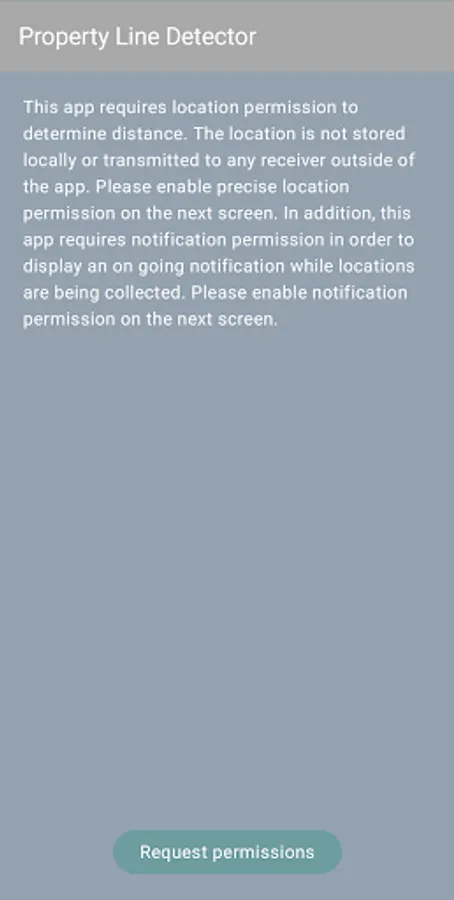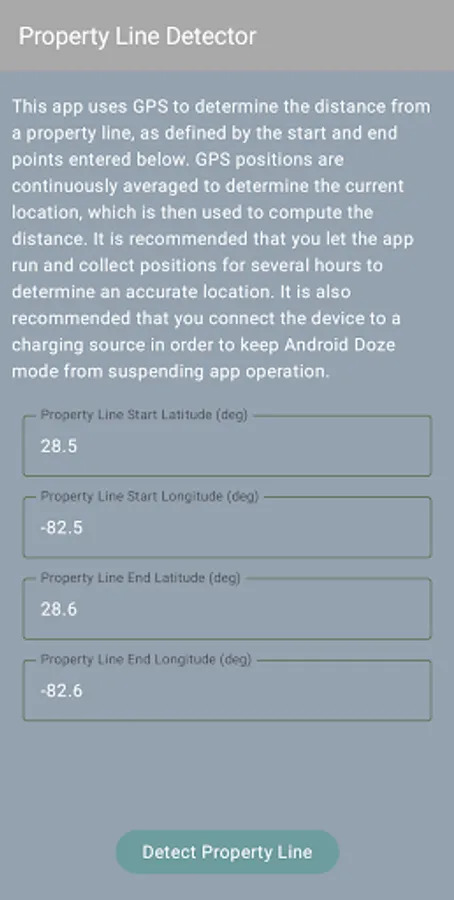 This app uses GPS to determine the distance from a property line, as defined by the start and end points entered. GPS positions are continuously averaged to determine the current location, which is then used to compute the distance. It is recommended that you let the app run and collect positions for several hours to determine an accurate location. It is also recommended that you connect the device to a charging source in order to keep Android Doze mode from suspending app operation.