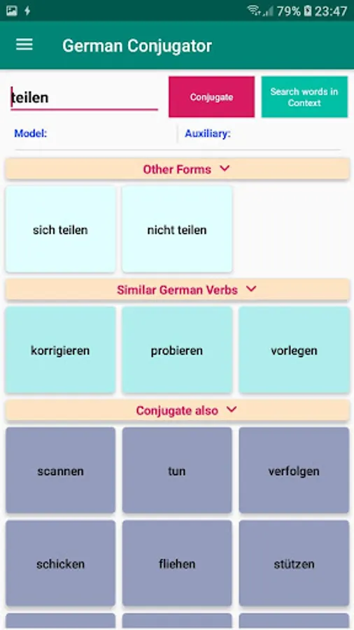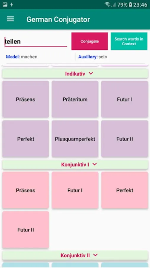 *In German, you can type in and conjugate infinitive forms such as "machen", "sammeln",... but also conjugated forms like "mache", "geliebt". The conjugator recognizes reflexive verbs ("sich rasieren") and negative forms ("nicht machen"), as well as verbs with separable or inseparable prefixes (e.g.: be-, ge-, heraus-, vorweg-).