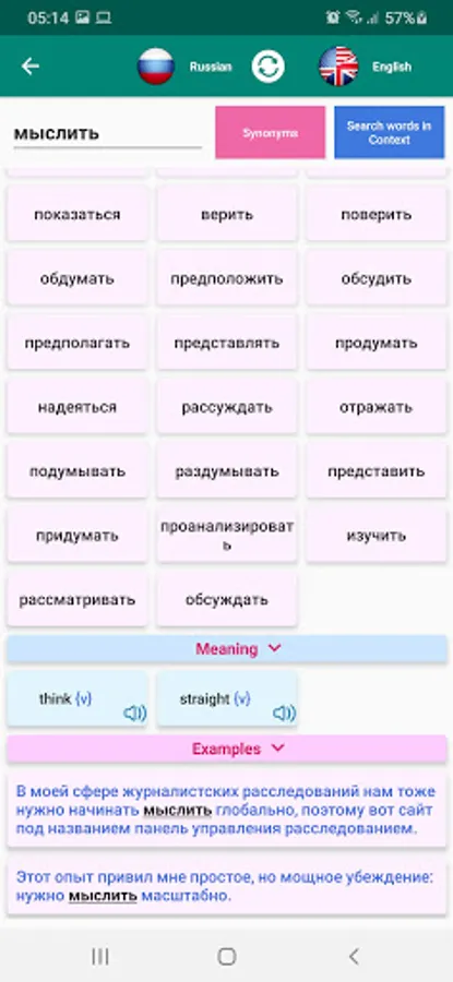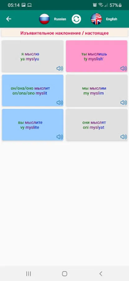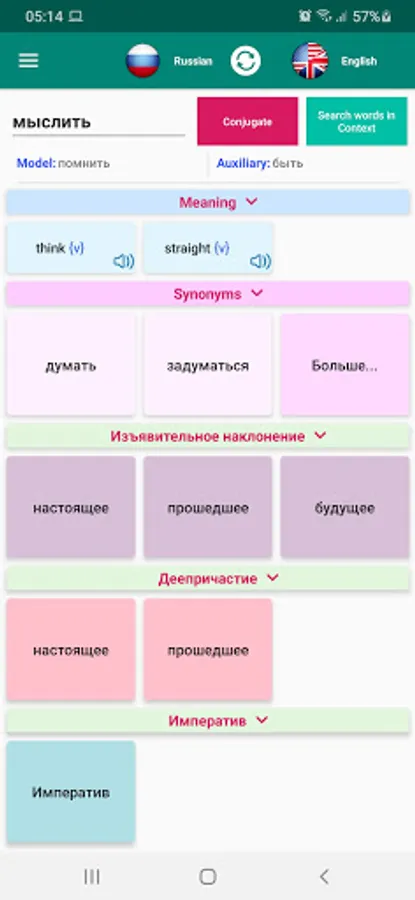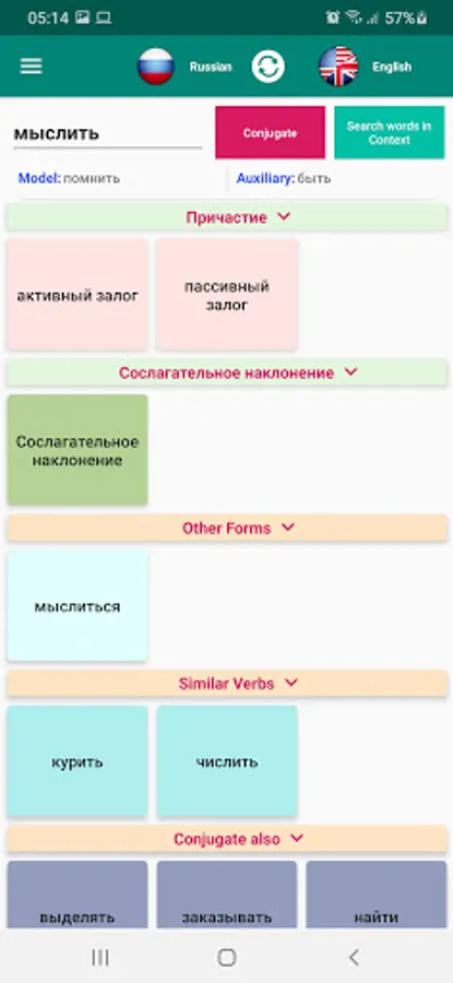 Conjugate verbs in Russian with our App. Learn conjugation rules and consult the list of conjugation models. Translate verbs in context or find their definition.