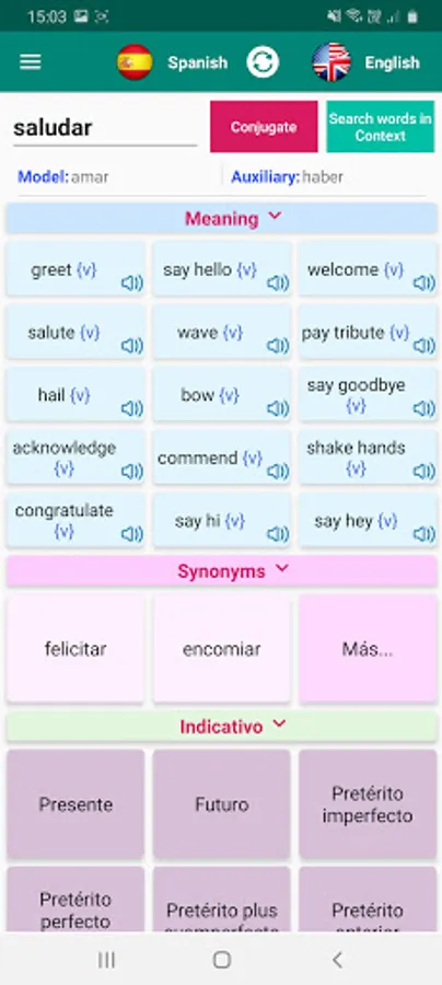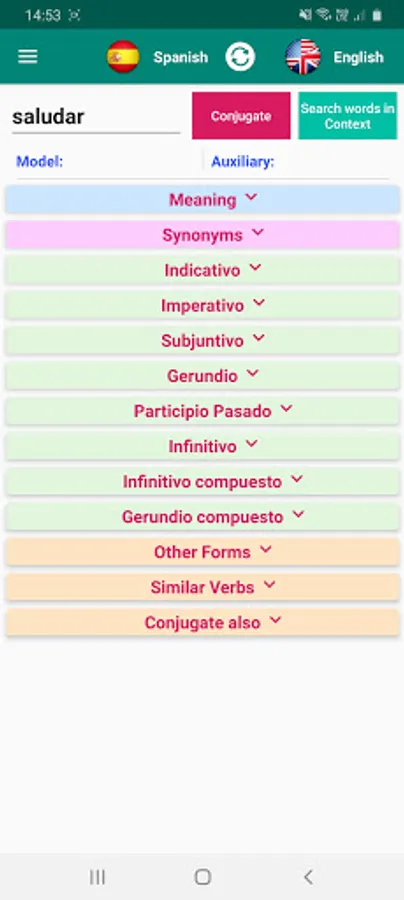 Conjugate verbs in Spanish with our App. Learn conjugation rules and consult the list of conjugation models. Translate verbs in context or find their definition.