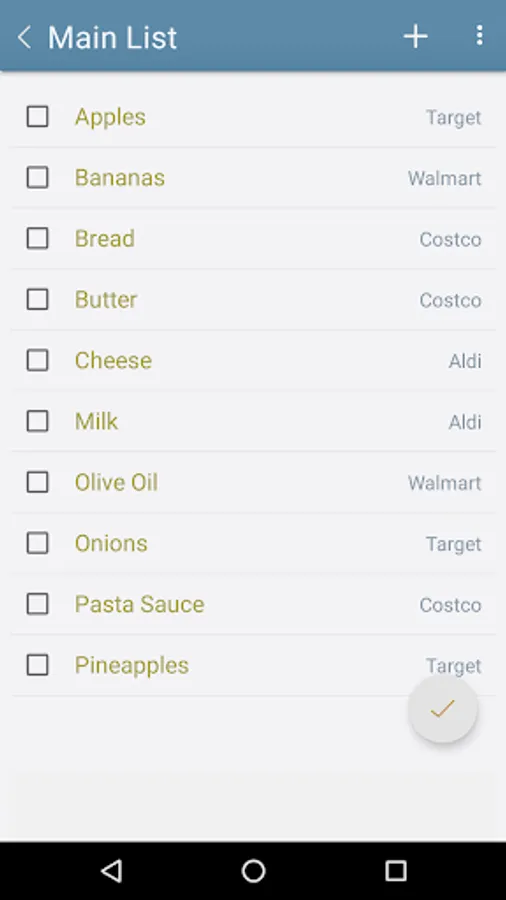 You will never need to create grocery or shopping list over and over again. All you need to do is check items from the 'Main list' to add to your shopping list.