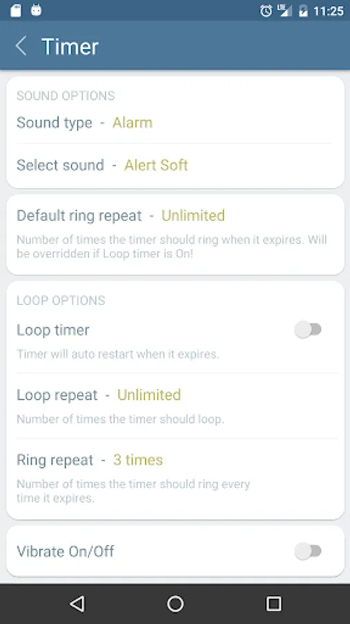 Loop Timer: Timer will automatically repeat when finished. You can set up the number of times the timer should loop and ring repeat.