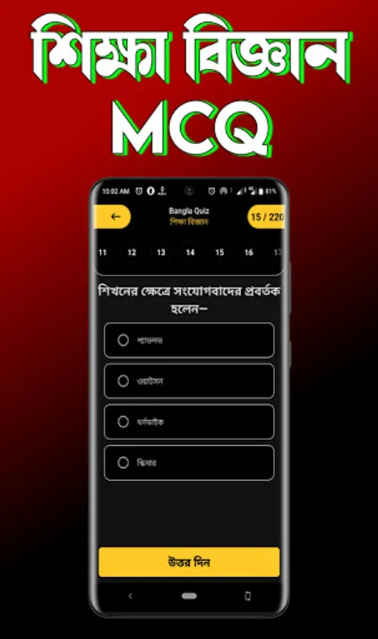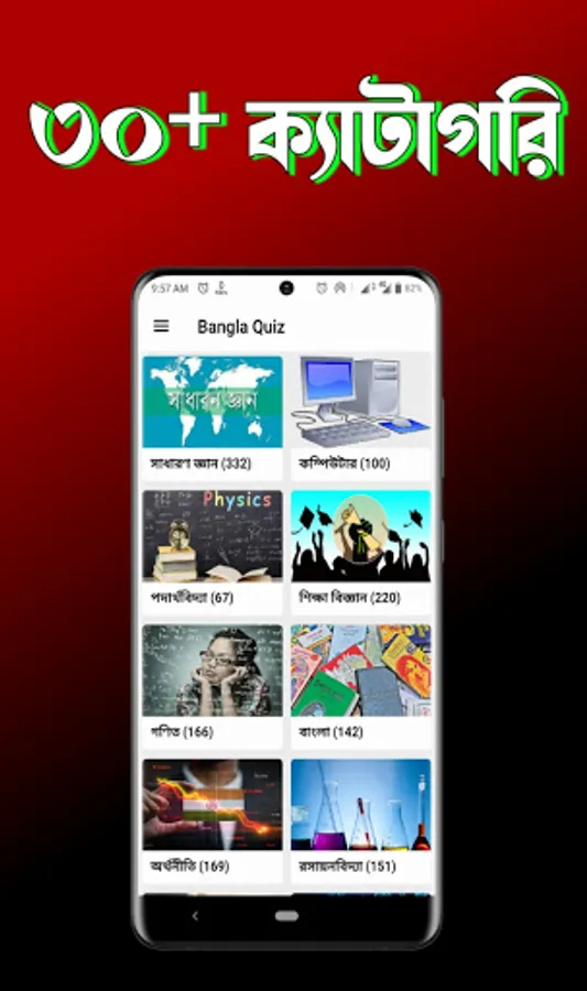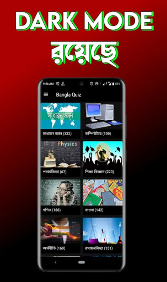 Because Bangla Quiz This app has 20+ categories and has 20,000+ MCQ questions and answers. All questions and answers are in Bengali. You will have to choose the correct answer from any question which has four answers.