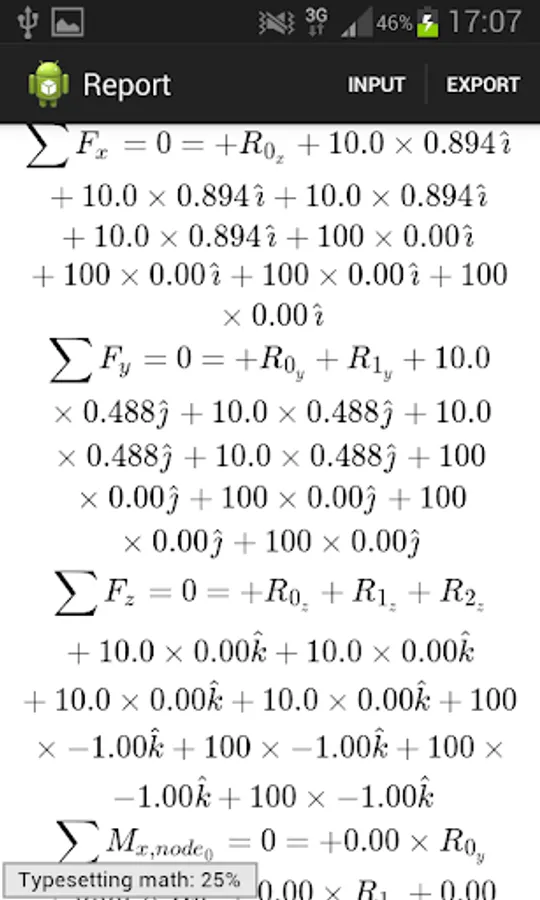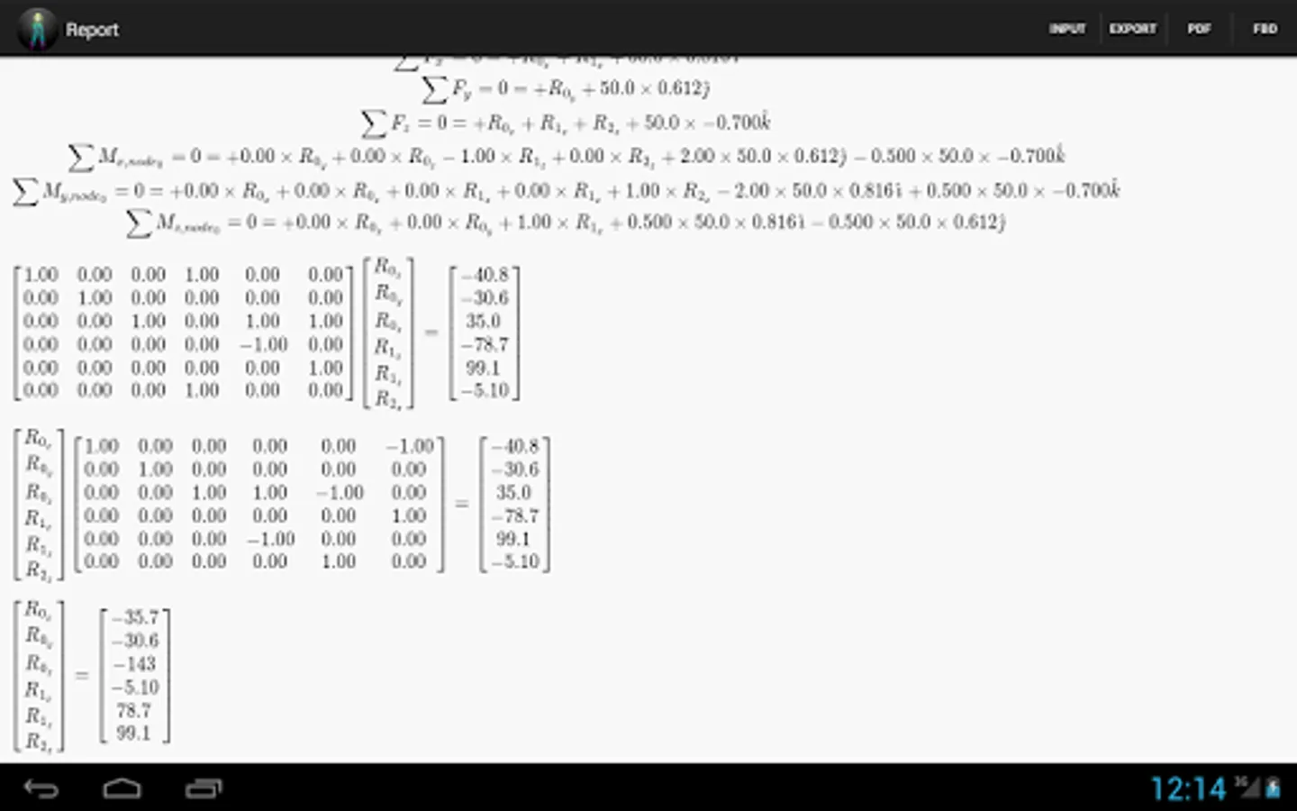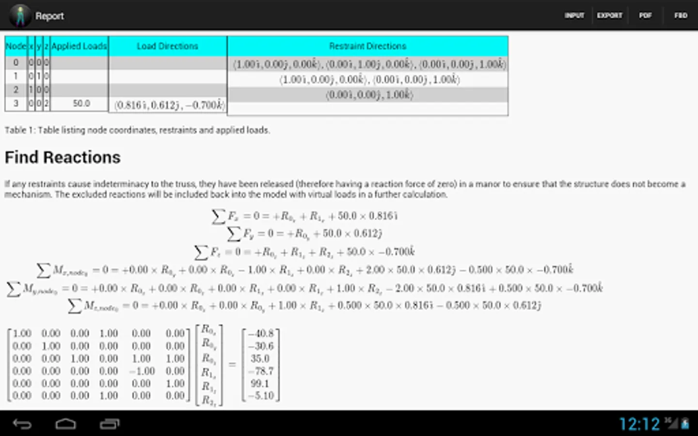 3D Truss - Hand Analysis automatically generates the hand calculations required to solve any statically determinate or indeterminate truss. The generated report shows all the steps that are required to solve these problems by hand, with well formatted and neat calculations within a customizable report (HTML & Latex PDF) that can be viewed on the phone or easily exported to another device or computer. This app is well suited for first and third year engineering students to learn statics and structural analysis, tutors and lectures to quickly provide fully worked solutions and practicing civil, mechanical, aeronautical and structural engineers who would like an alternative method to check finite element results or provide hand calculations.