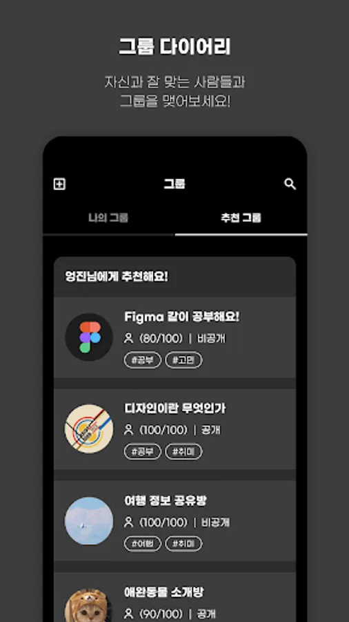 Group Diary - You can set up to two interests and write and view the diary within the created group! Record your day in multiple groups!