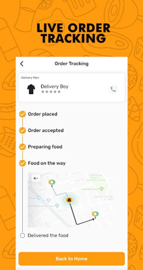 - Get real-time updates on your order status and track your Delivery Boy’s location on a map from the restaurant to your doorstep.