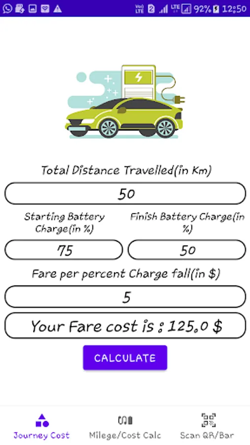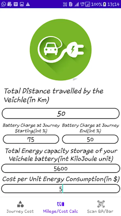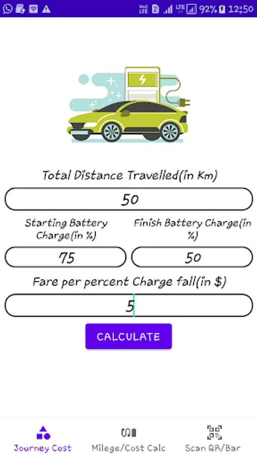 Easy to Calculate your Electric Vehicle Mileage by your battery charge percentage changing , calculate journey cost fare of any EV , and Scan any QR and Bar Codes on EV to explore details.