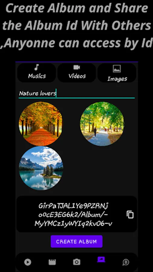 Create albums and share the album id easily quickly instead of sharing the all album pictures ,Musics or videos and anyone with the album-id see your album.