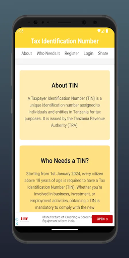 Permission: The app provides access to publicly available content related to TIN registration. Its sole purpose is to simplify the process of acquiring TIN numbers and promote awareness of the importance of tax compliance in Tanzania.