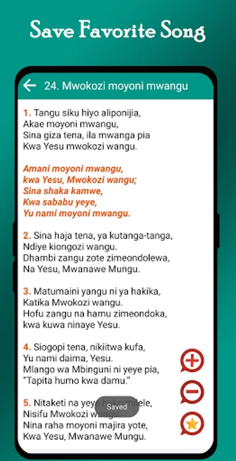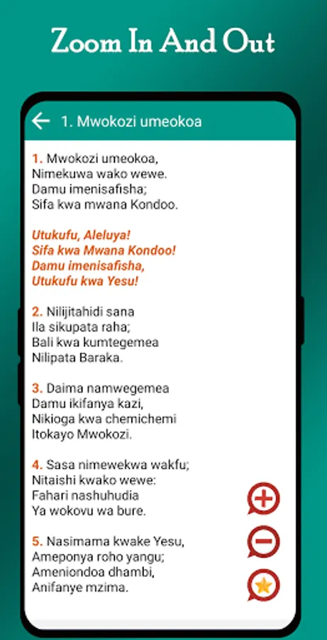 We built this app for you. We designed it to be intuitive, and simple. Download and you will love it. Check to screenshots to see exactly how the UI is. Tenzi Za Rohoni - Swahili Songbook is for you.