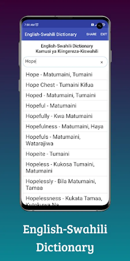 Free English-Swahili, Swahili-English translator and Dictionary App.