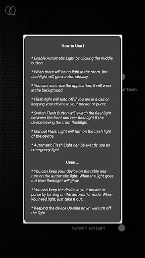 * Switch Flash Button will switch the flashlight between the front and rear flashlight if the device having the front flashlight.