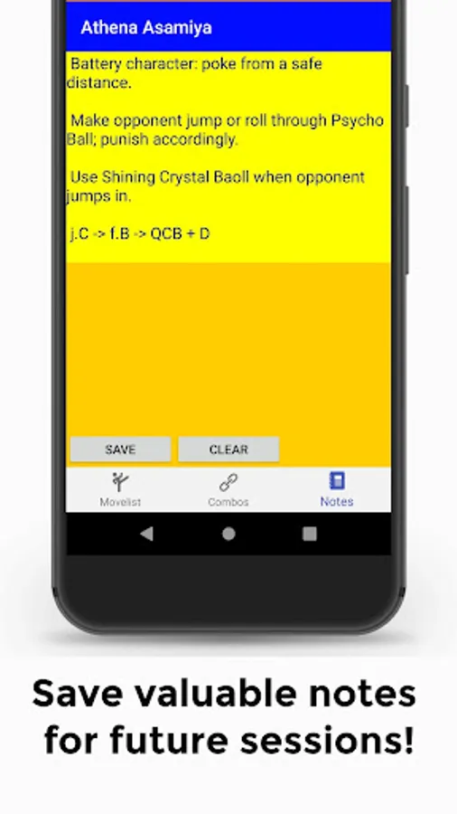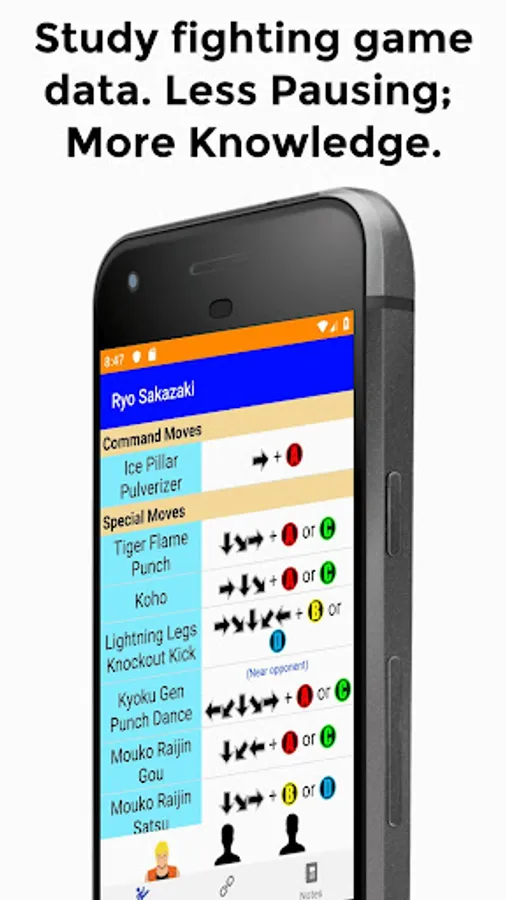 The King of Moves provides users with move data from a cast of over 200 characters across multiple games. Combined with the ability to record and view notes makes KoM the perfect companion app for fighting gamers!
