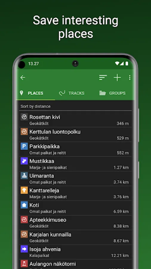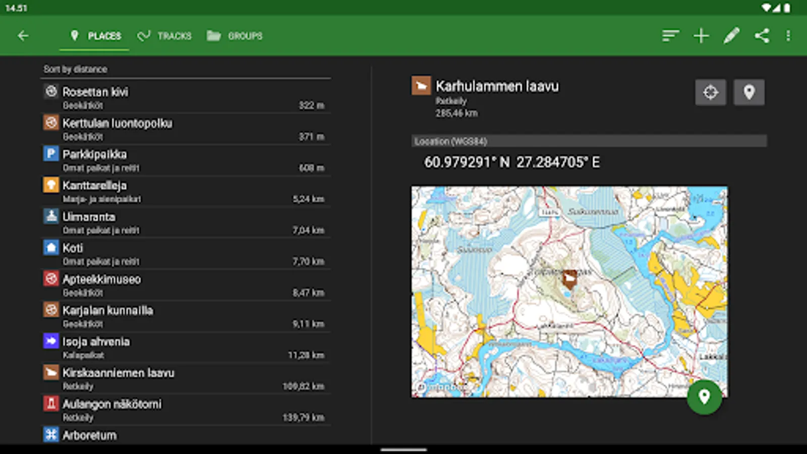 • Coordinate display formats: WGS84, ETRS-TM35FIN, YKJ, KKJ, and MGRS