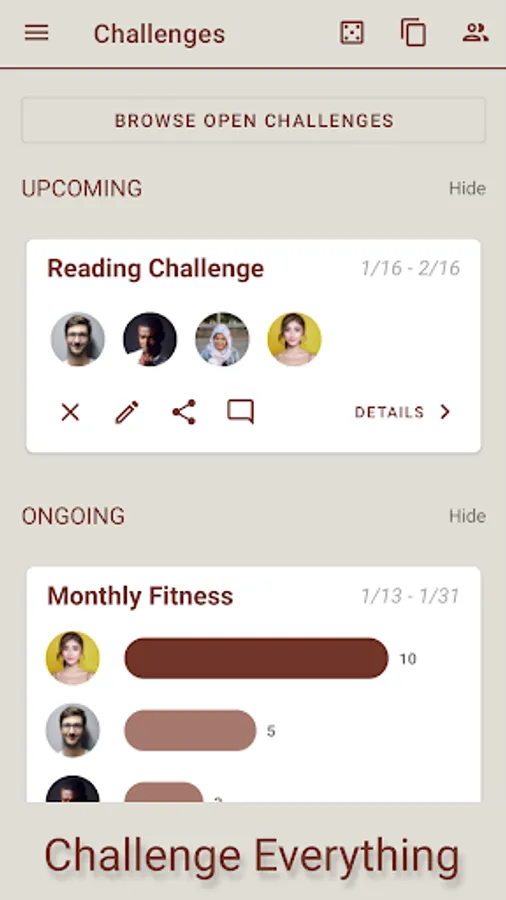 Habits form through repetition. The act of committing to a challenge, and repeating the challenge over and over will build habits over time. If you want to eat healthier, create a weekly challenge involving calorie logging and choosing healthier foods. If you want to be more active or productive, create challenges for getting things done. The key is repetition and inviting friends and family to keep you accountable!
