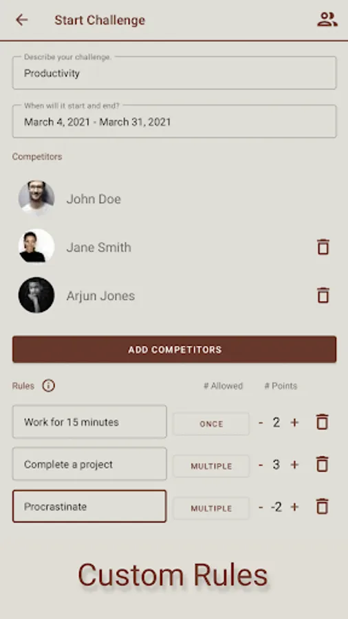 In Pointagon, a challenge consists of a set of rules you strive to complete each day. The rules can be anything you want. Each rule has a point value associated with it. You also have the ability to specify whether the rule can be finished once or multiple times in a day. To start a challenge in the app, you fill out a simple form, and invite your friends and family. After that, you log your points earned each day. The person with the most points at the end of the challenge wins!