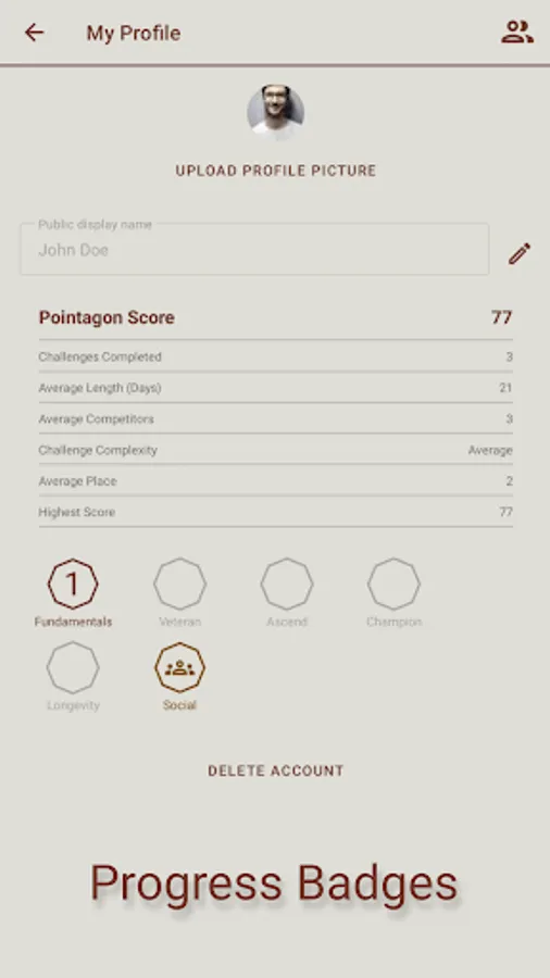 Pointagon provides badges and stats to help you evaluate your progress over time. We also give you a Pointagon Score that increases based on your challenge performance! The amount it increases by depends on your place in the challenge, how long the challenge lasted, and how many people were in the challenge. See your stats and the badges in the settings page and compare them with your friends and family!
