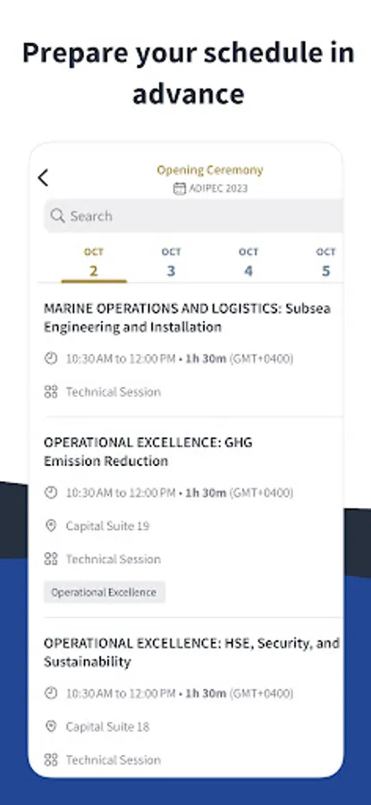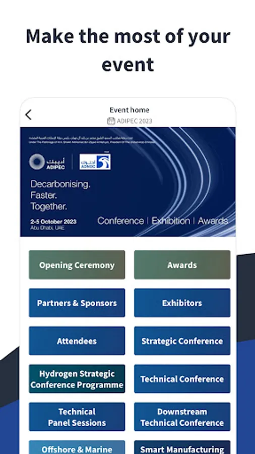 The ADIPEC app is the official platform for attendees to start their ADIPEC experience. The platform includes features such as one-to-one networking, a place to watch content from the show including onsite interviews and on-demand sessions, and is also our dedicated event app with exhibitor listings, conference programme, the floorplan and tools to make the most of attending.
