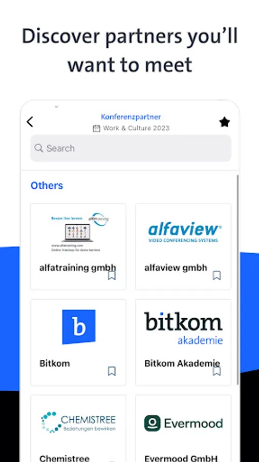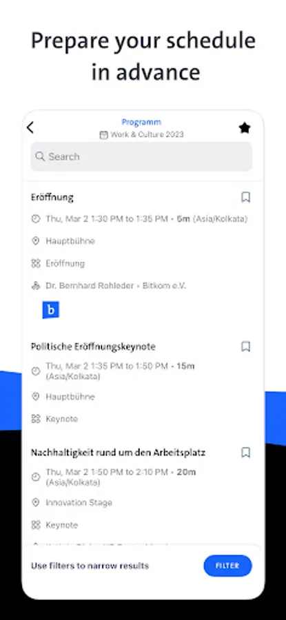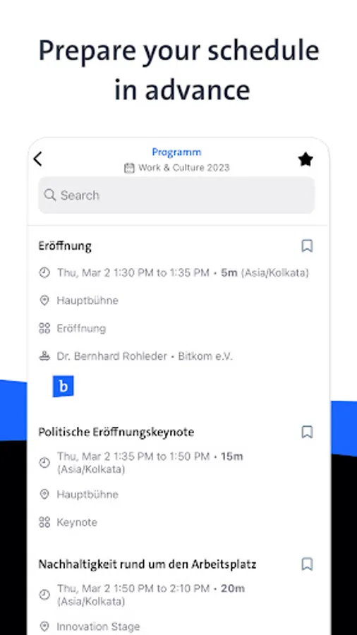 The Bitkom Events App offers you tools to make your visit to a Bitkom digital conference as easy as possible. Make your visit even more convenient with the app. Keep track of all Bitkom events and find your profile and contacts in one place.