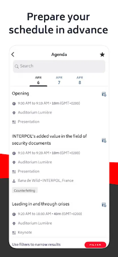 Available to registered delegates only, the app includes a fully searchable conference agenda that lets you build your own custom schedule and easily export it to your calendar. So that you can stay organised, from session to session, and from meeting to meeting.