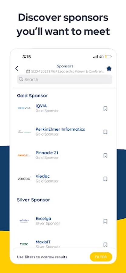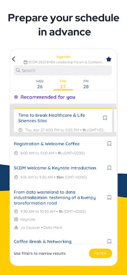 Bookmark your favourite sessions and interact with your peers directly in the app. The app will keep you up to date with upcoming sessions and important events taking place during the conference.