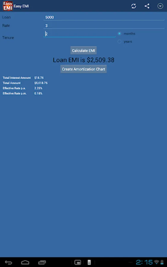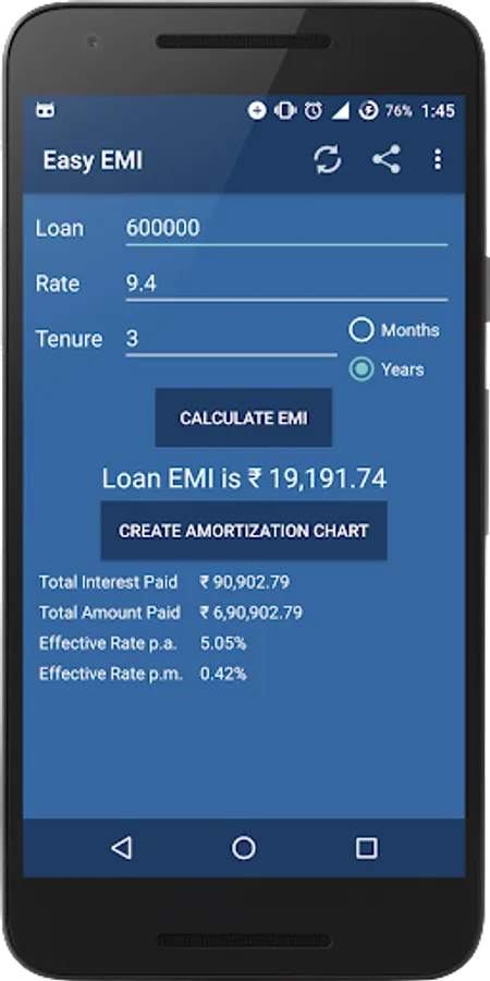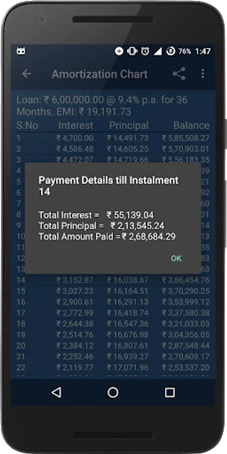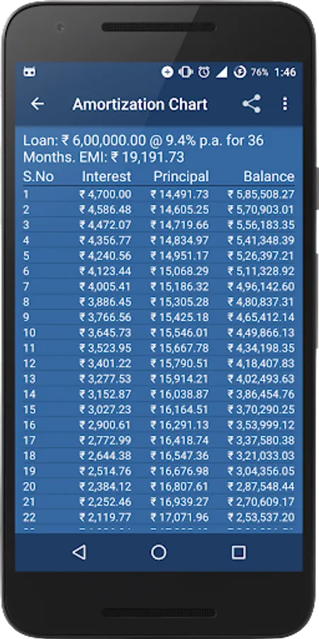 - View and share repayment details with reducing balance (Amortization Chart Table)