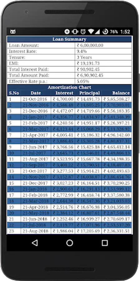 - Long tap on an EMI row to view interest and principal payment details till that EMI