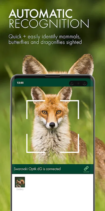 In combination with the SWAROVSKI OPTIK dG, the free SWAROVSKI OPTIK Wildlife ID app enables the automatic identification of a total of 100 mammals, 200 butterflies and 50 dragonflies that can be observed in the wild across Europe. Capture your experiences as photos or share your discoveries via livestream.