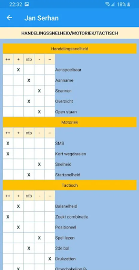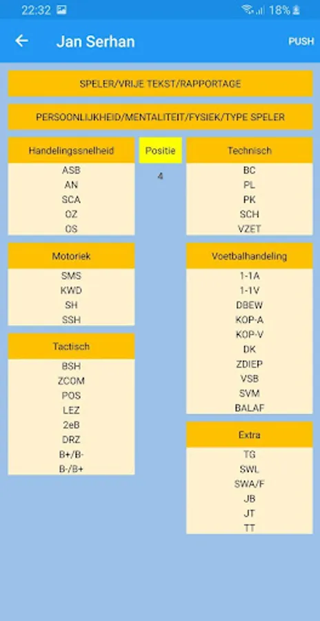 Due to the fact that you, as a soccer scout, has to write down a lot, we started to work with abbreviations. By working with this method you have more time to detect the skills of the player. By using abbreviations you can add and recognize more skills. The pleasant side-effect of this App is that the scout is forced to have an opinion about 57 different skills
