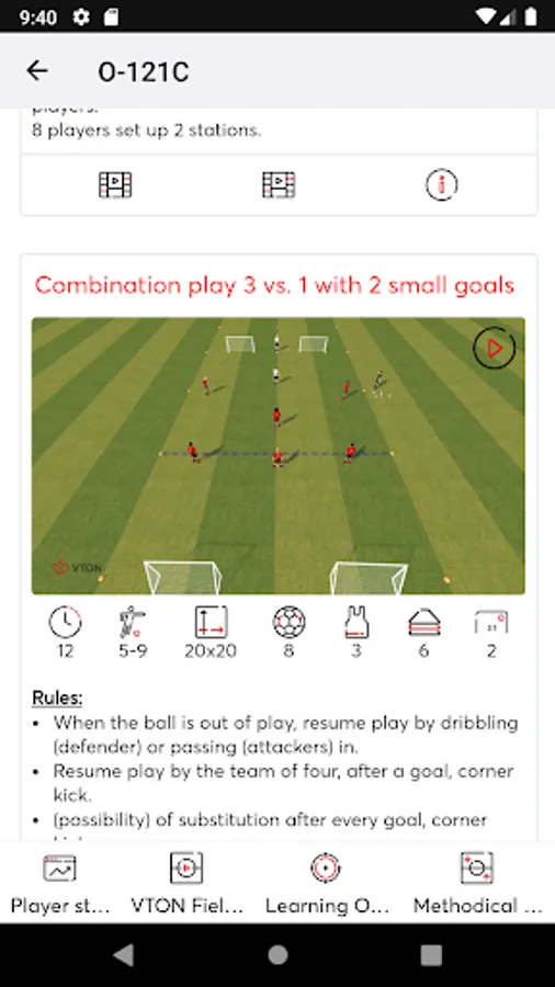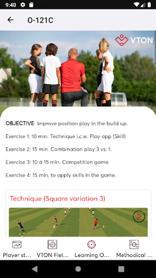The offline VTON-Coach app is part of the VTON platform, the platform developed for and by (youth) coaches in the Netherlands. It contains a unique curriculum per age category and all training sessions are based on objectives. The methodology contains 900 unique exercises, 972 training sessions, multi-week, and annual programs.