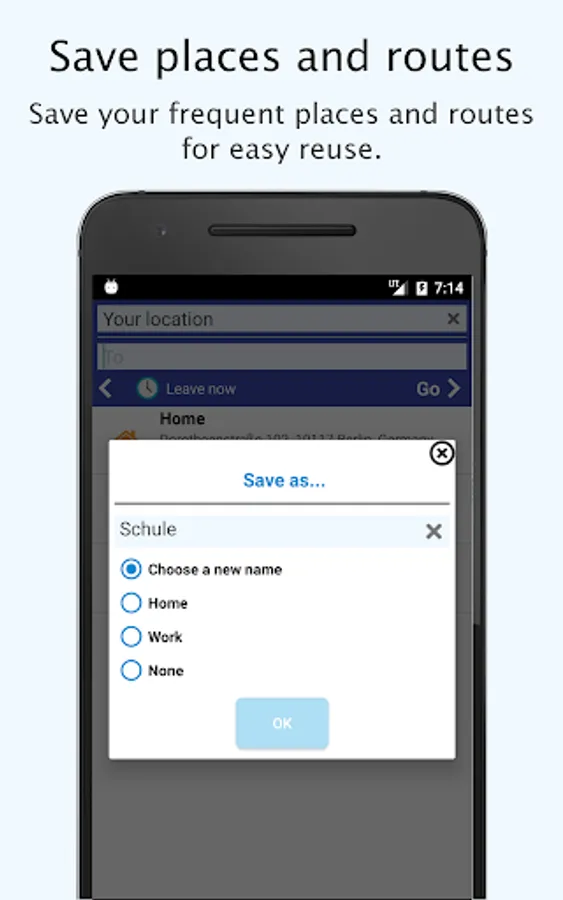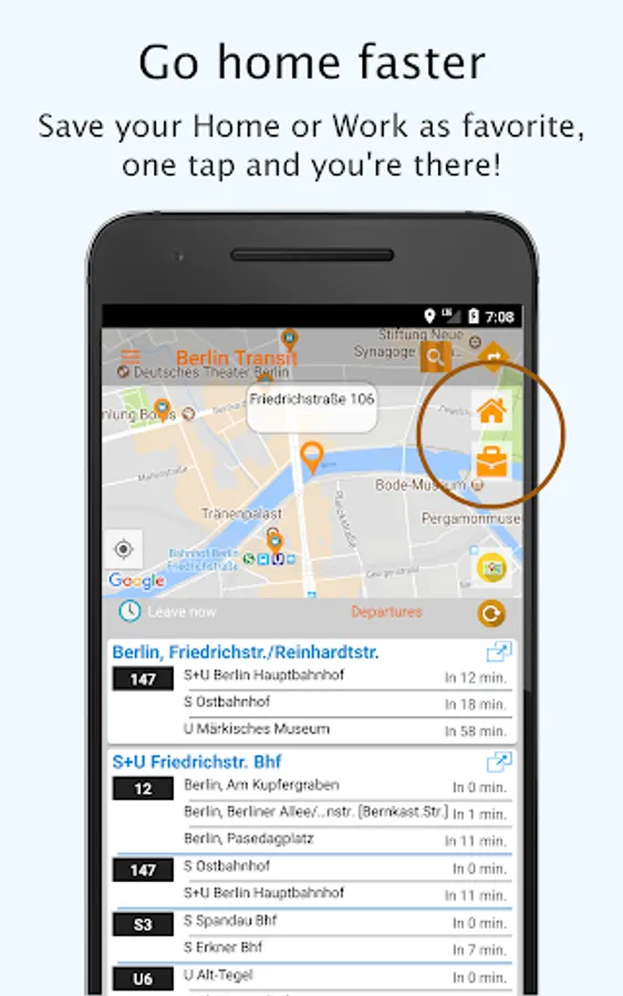 Save valuable time with dedicated shortcut buttons for home and work. With just one tap, Berlin Transit provides you with the fastest public transport route to your destination, complete with estimated time and delays. Set your current location as Home or Work in a single step on the map – it's that simple!