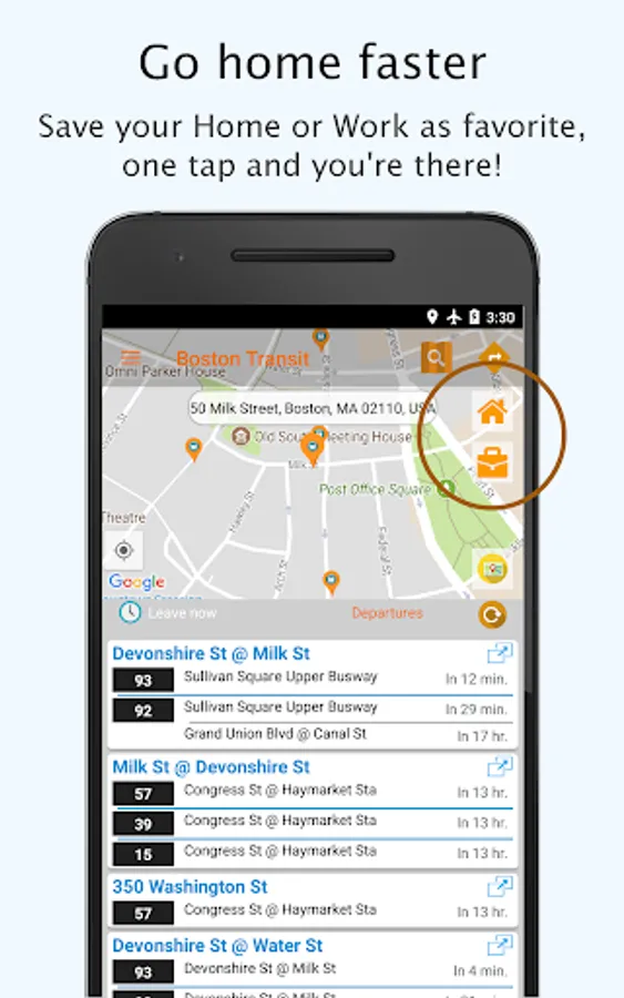 With dedicated shortcut button to home and work, get public transport route to your destination in just one tap with estimated time and delays. Pick your current location on the map and set as Home or Work in single step. That's easy!