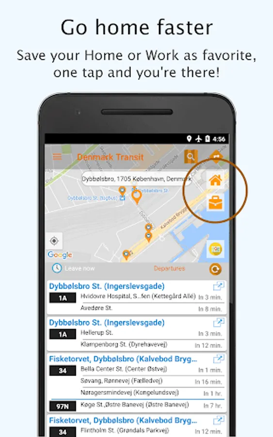 With dedicated shortcut button to home and work, get public transport route to your destination in just one tap with estimated time and delays. Pick your current location on the map and set as Home or Work in single step. That's easy!