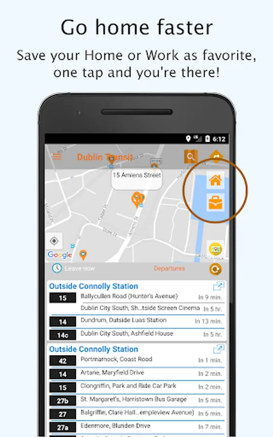 With dedicated shortcut button to home and work, get public transport route to your destination in just one tap with estimated time and delays. Pick your current location on the map and set as Home or Work in single step. That's easy!