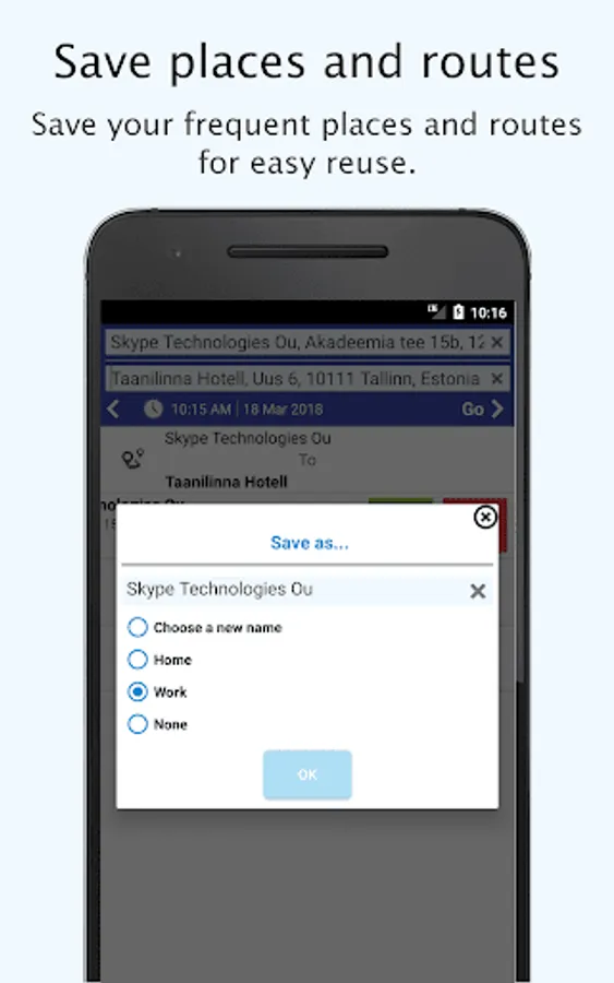 Save your places as Home or Work or even with any custom name, for example to your contact name, school, hotel, university.