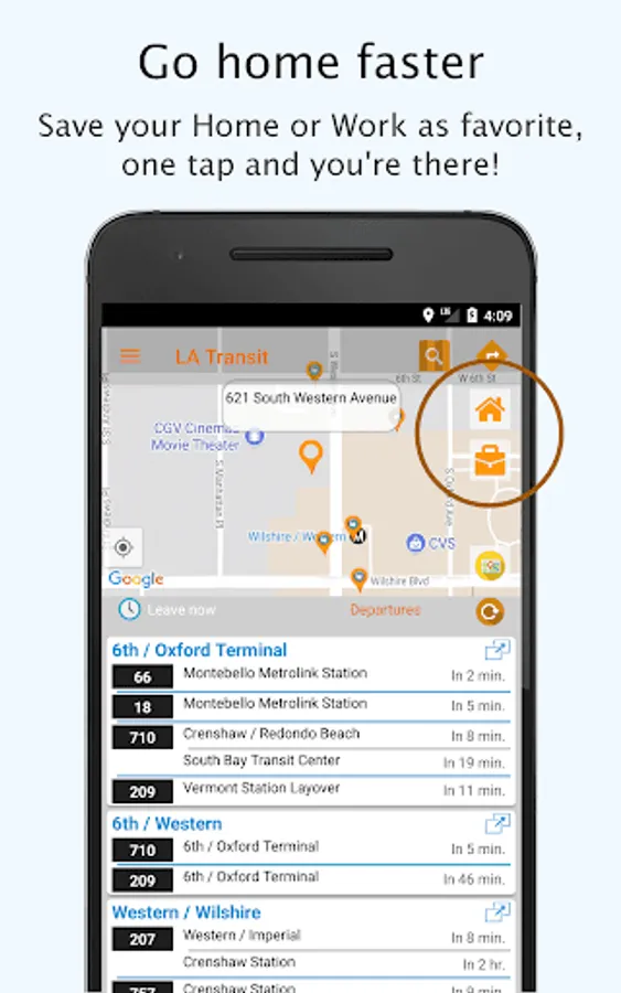 With dedicated shortcut button to home and work, get public transport route to your destination in just one tap with estimated time and delays. Pick your current location on the map and set as Home or Work in single step. That's easy!