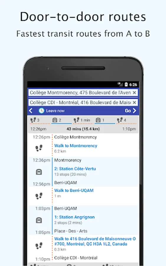 Navigate your city with optimal transit routes, hassle-free using Trains, Metro, Subway, Buses, Trams, Ferries / boats, Underground...