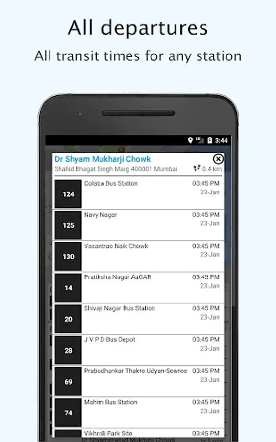 Departures timetable for Metro, Local, Suburban, Monorail, Bus from MMOPL, MMRCL, MMRDA, BEST, NMMT, MBMT and many more!