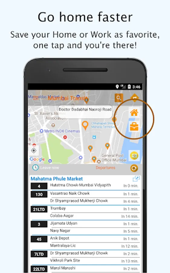 With dedicated shortcut button to home and work, get public transport route to your destination in just one tap with estimated time and delays. Pick your current location on the map and set as Home or Work in single step. That's easy!