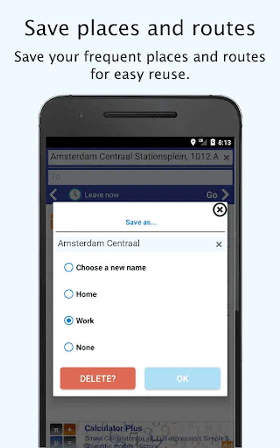 Save your places as Home or Work or even with any custom name, for example to your contact name, school, hotel, university.
