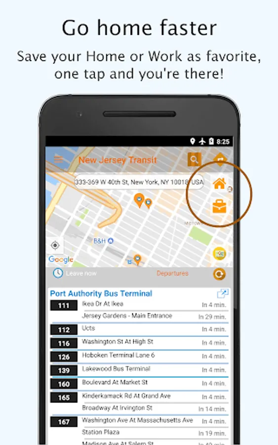 With dedicated shortcut button to home and work, get public transport route to your destination in just one tap with estimated time and delays. Pick your current location on the map and set as Home or Work in single step. That's easy!