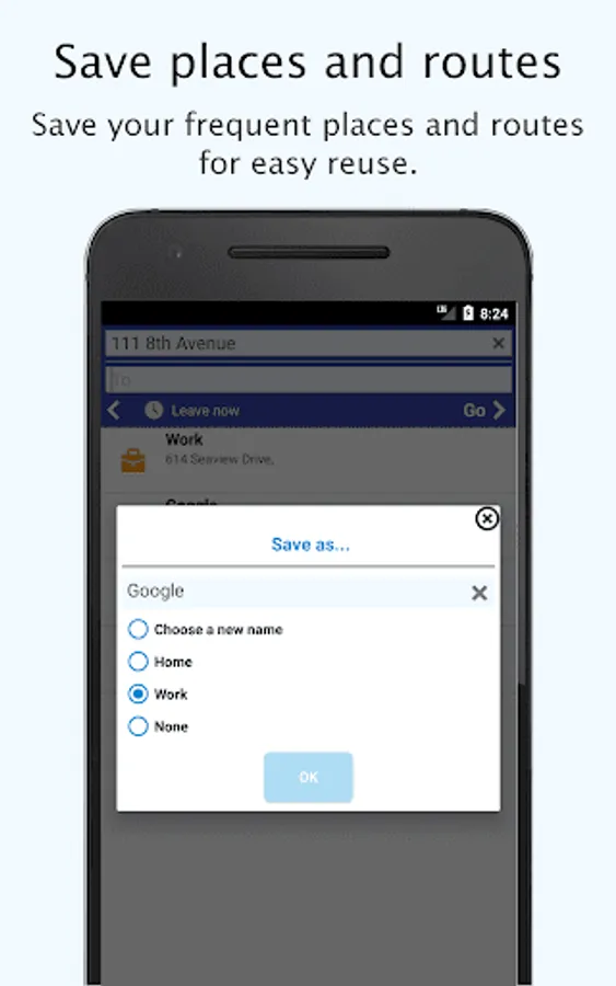 Save your places as Home or Work or even with any custom name, for example to your contact name, school, hotel, university.