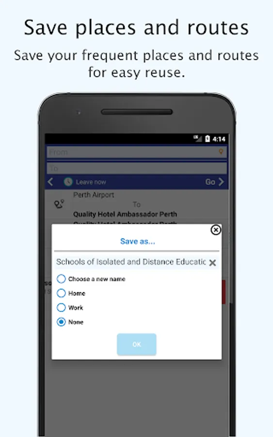 Save your places as Home or Work or even with any custom name, for example to your contact name, school, hotel, university.