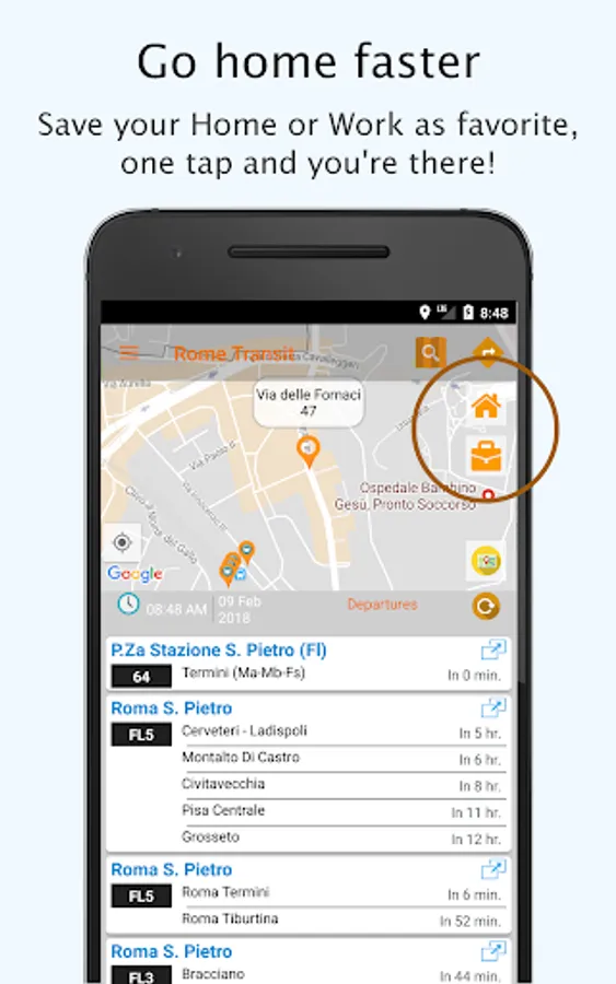 With dedicated shortcut button to home and work, get public transport route to your destination in just one tap with estimated time and delays. Pick your current location on the map and set as Home or Work in single step. That's easy!